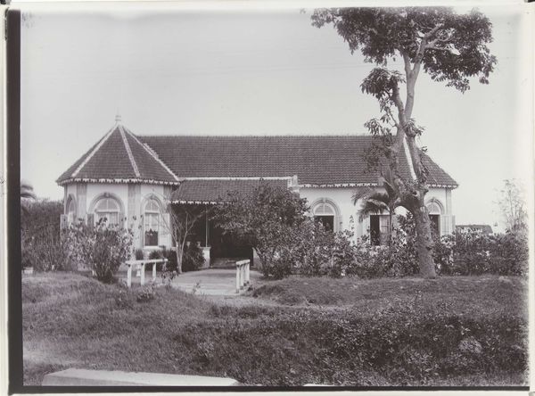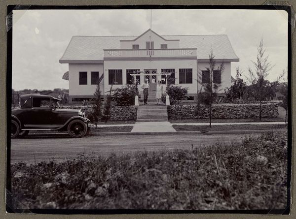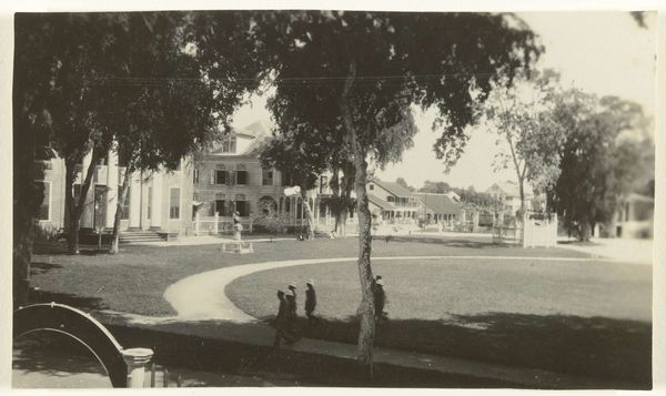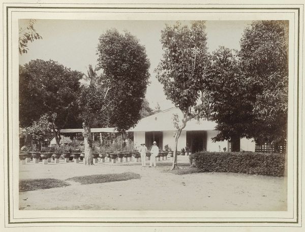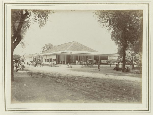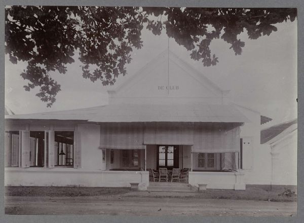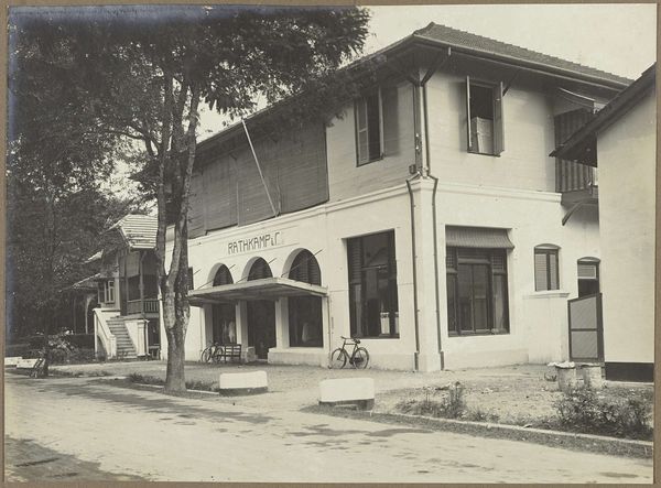 Editor: We're looking at a black and white photograph entitled "Gebouw van Rathkamp & Co.", dating from 1914-1919. The architecture is so interesting. I love how the artist plays with shadow and light. What I wonder is, how should we even begin to interpret this building as art? Curator: It whispers tales of Dutch colonialism, doesn't it? Those grand verandahs, that imposing structure, softened, almost obscured by lush tropical trees – it’s a power dynamic made visible, frozen in time. I imagine the artist carefully choosing this angle, emphasizing the weight of "Rathkamp & Co." alongside the vibrancy of the landscape. Do you see it too? Editor: Yes, I see it. But it also feels… nostalgic? Or am I completely off base? Curator: Nostalgia’s a powerful lens, and perfectly valid. Perhaps the artist, whoever they were, felt a pang of something akin to regret or longing. Think about what was lost and gained in that era, the uncomfortable juxtapositions of progress and oppression. Does the anonymity of the artist play into that feeling for you at all? Editor: It adds another layer for sure, knowing there isn’t a specific author to question. The photographer, their perspective remains unknown to us. Thanks to you I am now feeling those contradictions much more acutely now than when I started. Curator: And I think that's the beauty of it all. A simple photograph sparking a multitude of perspectives! Every little thing – that dappled light on the building, the bicycle casually leaning against the wall – contributes to a dialogue that spans continents and generations.