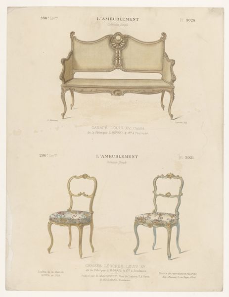 This print showcases four chair designs in the Louis XV style. Note the cabriole legs, the soft, sinuous lines, and the floral patterns adorning the upholstery. These are not merely chairs; they are embodiments of an era steeped in luxury and aristocratic refinement. The floral motifs harken back to ancient symbols of fertility and abundance, echoing in tapestries and frescoes across millennia. Observe how similar forms appear in Renaissance paintings, adorning the robes of goddesses, or even in Minoan frescoes. The curves, derived from natural forms, suggest a connection between man and nature, reflecting a longing for harmony. But consider also the psychoanalytic dimension. These chairs, designed for leisure, speak to a collective desire for comfort and escape from the harsh realities of life. Isn’t it a compelling commentary on human desire, recurring and transforming, as societies evolve? The Louis XV style, itself a revival, demonstrates how such aesthetic languages never truly vanish. They are cyclical, like the seasons, always returning, transformed but never forgotten.