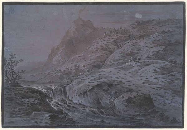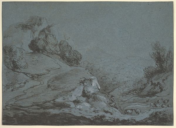 Editor: Here we have "Rocky Landscape with Shepherd and Flock" by François Louis Thomas Francia, currently at the Harvard Art Museums. The monochromatic blue feels quite somber. What strikes you about the composition? Curator: The tonal unity is indeed compelling. Note how the artist uses line to create texture and depth, leading the eye through a carefully constructed space. Observe the contrast between the smooth sky and the rough, detailed foreground. Editor: Yes, the details in the foreground are really interesting! What does that contrast suggest to you? Curator: It proposes a dichotomy: the macro versus the micro, perhaps, or the eternal versus the temporal. Do you notice how the shepherd is positioned almost as a part of the landscape, further emphasizing this relationship? Editor: That's a great point; it all seems carefully arranged. I'll definitely look at landscapes differently now.