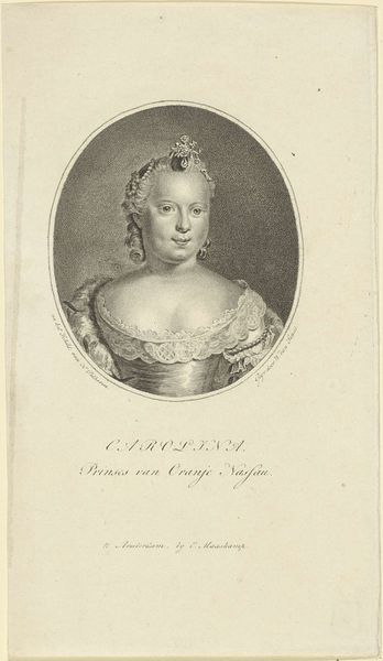 Curator: Standing before us is a finely rendered engraving, dating from around 1787-1834. It is titled "Portret van Carolina, prinses van Oranje-Nassau" and is currently housed here at the Rijksmuseum. Editor: There's a delicacy to the hatching here, an almost gossamer quality, despite the formality implied by the subject’s status. It strikes me as both intimate and distant. Curator: Indeed. Carolina, Princess of Orange-Nassau, lived through a turbulent period, witnessing revolution and political upheaval. As a woman of power and privilege in a shifting social landscape, her story is often overlooked in dominant historical narratives. This portrait, by Willem van Senus, can act as a keyhole into the experiences of women navigating such power structures at the time. Editor: I'm drawn to the composition itself. The oval frame tightly contains her image, concentrating our gaze on her face, the light catching the subtle contours. Semiotically, it almost suggests a trapped feeling despite her crown. There’s a visual tension that speaks to constraint, don't you think? Curator: Certainly. And considering the rigid expectations placed upon women of her rank to maintain dynastic alliances and project unwavering support for established systems, that sense of constraint would become embodied and manifest within her own actions and choices. That tight framing then begins to act as a metaphor for that feeling, resonating strongly. Editor: Note the detail in her crown, though—the precise execution is magnificent—the tiny points that pull the light, the exact placement that seems so essential in conveying royal lineage and status within this very reduced palette of light and shadow. It's about power—rendered almost surgically through very fine hatching lines. Curator: And the lace at the gown, too, speaks to how clothing, even then, was a form of silent protest or a loud statement of political alignment. Editor: Agreed. Overall, technically impressive in terms of linework and its neoclassical ideal of capturing not only likeness but presence and that status we’ve already talked about, no? Curator: Definitely, though perhaps understanding her wider impact—her role, as it were, in maintaining political structures—also allows us a far more nuanced perspective to consider what portraiture as an elite form has really communicated through the ages. Editor: I find it impressive in terms of conveying character through such limited means, and that Neoclassical element shines. It will be on my mind!