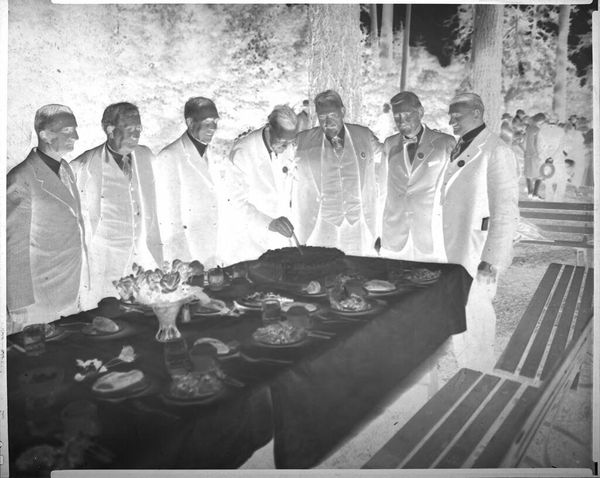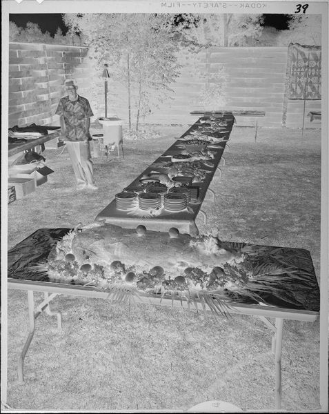 Curator: This photographic work, whose title reads simply "Untitled (roast pig for luau)" by Lucian and Mary Brown, presents us with a complicated cultural artifact. Editor: My first impression is of a tableau vivant—the roasted pig evokes complex ideas. The luau setting suggests community, feast, but also perhaps, issues of cultural appropriation and consumption. Curator: Precisely! Think about the symbolism of the pig across different cultures. In some, it represents abundance and prosperity; in others, uncleanliness. The luau, as a staged event for tourists, can become a commodification of Hawaiian culture. Editor: And this image, by not being explicit, becomes even more potent. The photographic negative complicates our interpretation. We're forced to grapple with the layers of meaning embedded within this seemingly straightforward image. Curator: Absolutely, and it challenges us to consider how we engage with and represent cultures that are not our own. Editor: It is a powerful reminder that even celebrations can carry heavy social and historical burdens.
