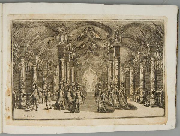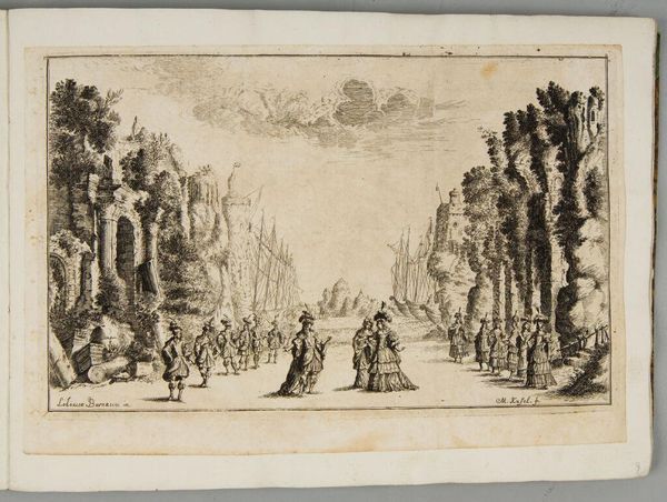 Editor: This print, titled "Pleasure Garden" by Matthäus Küsel, presents an intricate scene. The linear perspective is striking, creating a sense of depth and drawing the eye towards the center. What are your initial observations of the composition? Curator: The engraving technique is meticulous, demonstrating a clear understanding of line and form. Observe how the artist uses hatching and cross-hatching to create tonal variations and a sense of volume. Consider the interplay between the architectural elements and the figures; how does this relationship inform our understanding of space and scale within the artwork? Editor: It's fascinating how the artist uses these techniques to define shapes within the monochromatic palette. I see a structured vision of leisure. Thank you! Curator: Indeed. The formal elements work together to create a complex visual experience. Considering how the lines interact to create planes helps us appreciate the artistic intent.