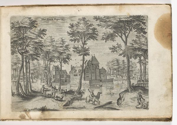 Editor: Here we have "Eggevoort" by Hans Collaert the Elder. It's an etching, and the detail is just incredible. What strikes me is the contrast between the hunting scene and the everyday life depicted in the background. What do you see in this piece? Curator: I see a careful depiction of labor and leisure. The act of hunting, seemingly for sport, required specific tools and skills. Consider the production of those weapons, the training of the dogs, and the overall societal investment in this activity versus the agrarian labor in the background. Editor: That's a really interesting point. It makes you wonder about the value placed on different types of work at the time. Curator: Exactly. And how the consumption of resources – the land, the animals – is presented within this visual economy. What did you learn? Editor: I learned to look beyond the initial scene and consider the layers of production and consumption.