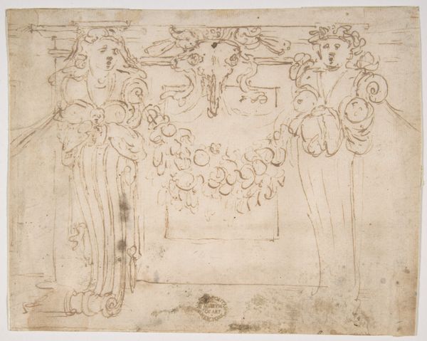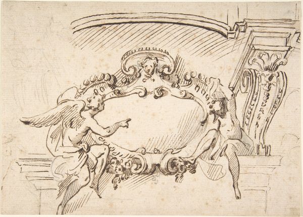Giovanni Battista Foggini rendered this design for an overdoor or niche top with pen and brown ink on paper. The composition swirls with Baroque dynamism; putti seem to tumble out of the architectural framework. Note how Foggini uses line to create depth and movement. The curves and flourishes, typical of Baroque design, aren't just decorative; they serve to destabilize the rigid geometry of classical architecture. The volutes, garlands, and the chubby putti introduce a playful asymmetry, contrasting with the more formal bust in the center. The sketch employs a semiotic system where classical motifs, such as the bust and architectural elements, meet the freedom of Baroque ornamentation. These elements challenge the solemnity of traditional portraiture with the lively chaos of putti and foliage, reflecting a broader cultural shift towards theatricality. This intersection offers a glimpse into the changing values of the period.
