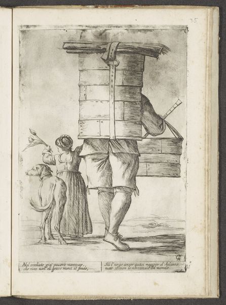 Editor: Here we have Giuseppe Maria Mitelli’s “Broodverkoper,” or “Bread Seller,” created around 1660. It’s an etching. The figure, weighed down by his wares, seems almost monumental despite its modest scale. I’m curious – what catches your eye when you look at this print? Curator: Immediately, the contrast between the man’s burden and the apparent symbolism around him strikes me. Look at the rosary beads hanging from his waist, the bread stacked high in the basket like some offering, even the simple jug in his hand. How might these items together reveal the emotional or spiritual state of this vendor? Editor: So, you’re suggesting these aren't just everyday objects, but symbols carrying deeper meaning? Curator: Precisely. In this era, food itself carried weighty significance, both literally and figuratively. Consider bread’s association with sustenance, survival, and even religious communion. And the man himself—does he embody hardship or humble dedication, or perhaps both? The artist presents these as intertwined, reflecting social values of the time. Does the man’s bowed head suggest weariness or humility, do you think? Editor: I see your point. Perhaps it is both! I hadn't thought about the symbolism of the rosary either. So, he’s carrying not only bread, but also a spiritual burden. It definitely makes me see the work in a new light. Curator: Indeed. Mitelli invites us to look beyond the surface and contemplate the intricate web of meanings embedded in everyday life. It’s a beautiful way to represent the connection between our physical and spiritual existence.