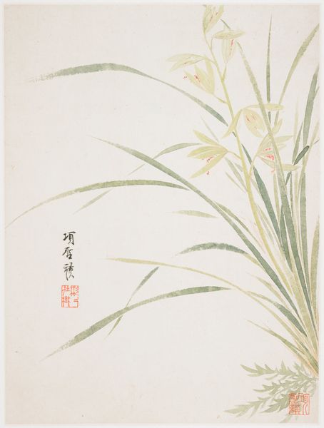 Curator: Well, this is charming! It's "Yellow Chrysanthemums," a hanging scroll in ink and color on paper, attributed to Hosokawa Rinkoku from sometime in the 19th century. Editor: There’s a wistful beauty to it. Like a memory fading at the edges. The wispy brushstrokes give such lightness to the blooms, it almost floats off the scroll. Curator: It’s fascinating to see Rinkoku move so seamlessly between image and text. The calligraphy seems as vital to the piece as the flowers themselves. The inscription is a poem that praises the chrysanthemum as a symbol of autumn, the brevity of beauty, even resistance, because Chrysanthemums also represent longevity. It is a layered piece for such simple elements. Editor: Definitely simple at first glance but looking again, what vase it sits upon really jumps out. Its base almost resembles a miniature stage, doesn't it? Thinking about the production, a painter selects their materials, preparing the ink and brushes… they’re choosing to represent the season in a very specific and cultivated way. Each stroke then reflects both artistic choice and a whole cultural narrative about flowers. Curator: Precisely. And look at the vase, how delicately rendered, not quite symmetrical, grounding the ethereal flowers in an object of everyday craft. And did the poem come before the image? During? I like to imagine Rinkoku stepping back, adding a stroke there, a character there. It would’ve been very mindful process. Editor: This makes me wonder if the artist themselves cultivated chrysanthemums, participating in its lifecycle, drawing inspiration and literal material from that experience. If we think about traditional practices of artmaking as tied to natural resources, this simple picture points to the means of accessing beauty from a social lens. Curator: I agree completely, it also has me pondering time... How we chase beauty, preserve it, witness it wane... "Yellow Chrysanthemums" seems less a portrait and more a quiet contemplation. Editor: I think I'll never look at flower arrangements the same way again! It all boils down to such intent: selecting materials, observing forms and, ultimately, reminding us about how we manufacture nature to see beauty in impermanence.