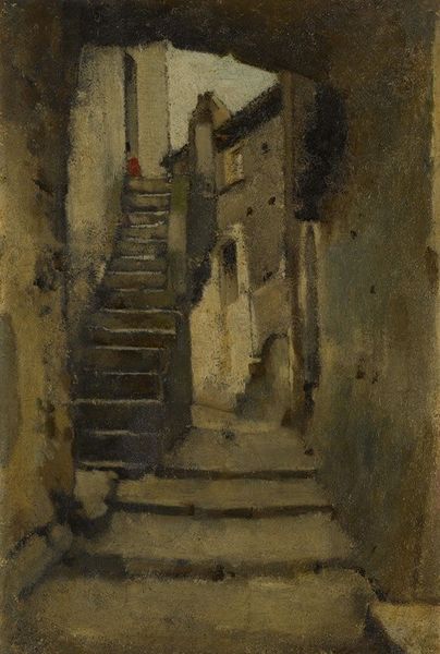 Editor: Here we have John Singer Sargent's watercolor, *Staircase in Capri*, from 1878. It's interesting; the painting is quite simple, yet the sharp contrast between light and shadow really makes it pop. What's your take on this work? Curator: Oh, this one whispers to me of summer afternoons and secret escapes. See how Sargent isn't just painting a staircase; he's painting the very air shimmering in the Italian heat? Those shadows aren't just dark patches; they’re almost characters themselves, dancing on the stone. The light is liquid here. Don’t you think? Almost palpable? Editor: I can definitely see what you mean about the airiness. It's all very dreamy. Did Sargent paint a lot like this? Curator: He certainly had his phases. What’s interesting here is how he almost abstracts the scene, doesn't he? He boils it down to these pure, geometric forms. Like the staircase itself is some kind of modernist sculpture hidden in plain sight! Editor: So, beyond just being a pretty picture of Italy, is there a deeper message, perhaps? Curator: Deeper message? Maybe just that beauty can be found in the everyday, the mundane. Think about it: a simple staircase becomes an artwork worthy of contemplation. Sometimes, that’s enough. What’s your feeling? Editor: That’s really beautiful. It's nice to think it could be just about the beauty of a single moment in time. Curator: Exactly! Sometimes, the simplest things are the most profound. You've got a great eye for the essentials, by the way. Keep trusting it.