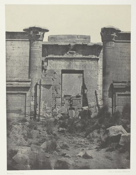 Edouard Baldus captured this photograph of the entrance to the Cour Lefuel of the Palais du Louvre using a calotype negative. The image presents a symmetrical architectural facade anchored by the columns and horizontal entablature. The limited tonal range lends a graphic quality to the scene, focusing the eye on the detailed textures of the stonework. The photograph’s composition emphasizes a structured hierarchy, from the heavy bases of the columns to the ornate friezework above. This formal arrangement reflects the 19th-century interest in order and classification. The image operates almost as a study in architectural semiotics; Baldus presents a system of signs where each element contributes to an overall representation of civic grandeur. Consider how Baldus captures the play of light and shadow to articulate form and texture. This technique elevates the photograph beyond mere documentation and invites us to consider the language of architectural form as a form of cultural expression. The photograph remains a complex interplay between objective recording and artistic interpretation.
