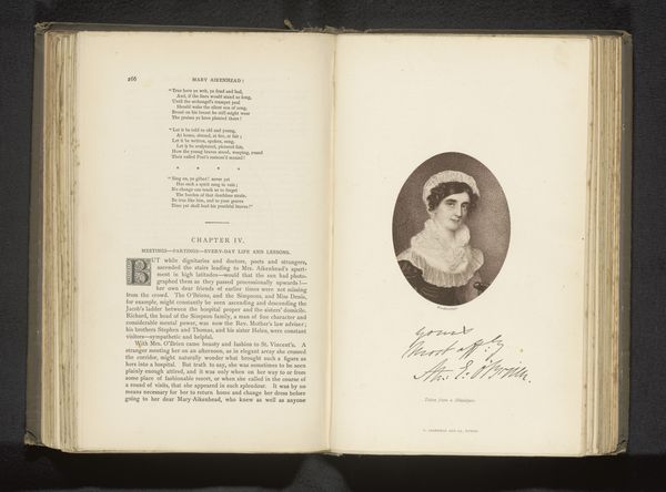 Editor: So, here we have what appears to be a photo reproduction of a painted portrait, showing Marie Henriette Anne, the Queen of Belgium. It's dated before 1880 and housed here at the Rijksmuseum. There's this lovely oval framing the subject and it all seems to be placed carefully within the leaves of a personal sketchbook. It feels quite intimate. What captures your attention most in this piece? Curator: Oh, the wistful gaze, undoubtedly! Doesn't it just invite you to wonder about the queen's story? You know, this "homemade paper" aspect hints at the kind of craft embraced during that period, a kind of proto-Instagram almost! But, beneath the aesthetic charm, I feel a touch of melancholy. Editor: Melancholy? I can see that. It's not your typical royal portrait. It's much softer. Curator: Precisely! What I see here isn't just a queen on display. Instead, I get a glimpse into her world and possibly some longing. What do you think gives it that softness? The oval shape perhaps? Editor: Perhaps it’s the muted tones? Or the combination of photography with what looks like hand-drawn elements? They lend an air of accessibility to a royal figure, blurring those lines, perhaps unintentionally? Curator: Absolutely! That blend softens the typical formality. Makes her less of a distant queen and more...a woman. Art’s funny like that, isn’t it? This feels less about immortalizing royalty and more about capturing a person, wouldn’t you say? Editor: It's really remarkable how this image captures not just a likeness but almost a feeling, an essence of the Queen. It makes me want to learn more about her life! Curator: Exactly! And that's what great art often achieves, sparking curiosity beyond the surface. A true invitation to dive into the stories etched within it. I love how, even through reproduction, a sense of intimacy prevails. Editor: Me too. I came expecting a stately portrait but discovered a quiet, reflective moment instead.