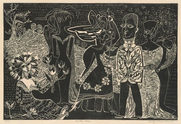 Curator: What a wonderfully chaotic image! This print, crafted by Imre Reiner in 1964, is titled "Shakespeare/Sommernachtstraum." It appears to be rendered in ink. My immediate impression is one of whimsical dread; the composition feels almost unsettling. Editor: I see that. It’s a visual interpretation of Shakespeare's "A Midsummer Night's Dream." The work is steeped in art history's influence, reflecting how visual arts often reimagine literary texts. Reiner is engaging with the historical themes of the play itself. Curator: Absolutely. And knowing that, my reading shifts. The lion looms large – it's clearly representative of the play within a play and the character of Bottom. But consider how Bottom’s hamartia becomes, here, a vehicle to reflect societal hierarchies. This work pushes beyond the slapstick, doesn't it? Editor: Certainly, viewing this within its production context helps understand Reiner’s purpose. Remember, '64 was a period of immense social upheaval, which perhaps infuses this print with a sharper, more cynical edge, contrasting Shakespeare's original intent for this kind of play. The post-war era grappled with class disparity and absurdism, impacting every form of representation. Curator: And the creature with the single eye and a flag... the figures could symbolize Oberon and Puck, but their stylized design complicates simple interpretations. Does that figure represent the ever-present voyeuristic forces impacting individuals across lines of identity? The lion’s teeth, after all, grin in silent agreement, the open maw being the stage itself. Editor: I agree. I wonder too how Reiner perceived public engagement with theatricality; who occupies positions of power and the silent audience within it? How could this print be representative of those questions. The imagery here highlights these complexities with remarkable density, layering social meaning within each mark of ink. Curator: Precisely, what initially seemed whimsical now carries significant weight, unveiling power structures ingrained in art, in storytelling, and in the narratives we tell ourselves. Editor: Absolutely, viewing this print prompts crucial discussions about social narrative that goes further than Shakespeare ever envisioned in writing.