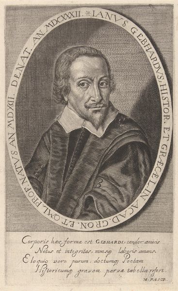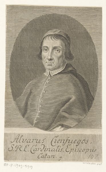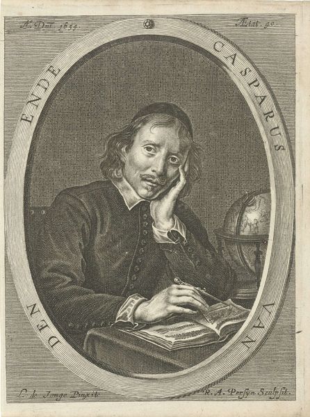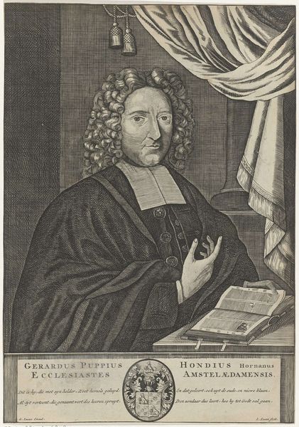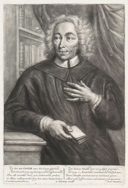 Editor: We’re looking at a drawing called "Portret van Guiljelmus Saldenus," created between 1660 and 1693, using charcoal and pencil. The level of detail achieved with such simple media is striking. What visual elements stand out to you? Curator: The meticulous handling of light and shadow immediately commands attention. Observe the tonal gradations across Saldenus's face, achieved through careful hatching and cross-hatching. How does this contrast with the rendering of the drapery in the background? Editor: It’s less defined, more atmospheric. It almost feels secondary to the subject, as if the artist wants you to concentrate on Saldenus and not much else. Curator: Precisely. Consider, then, how the artist guides our gaze. The subject’s pointed finger acts as a vector, directing our eye. Furthermore, contemplate the geometry inherent within the composition. Do you notice the interplay of vertical and horizontal lines and how this supports the overall structure? Editor: I do. The lines create a strong sense of order. Are you saying the use of geometrical shapes adds to the formality? Curator: Indeed. But note also the subtle asymmetry. His posture and gesture create a dynamic tension that prevents the image from becoming static. How would you interpret the significance of this imbalance in the otherwise formal setting? Editor: It makes him seem more alive and real. I focused initially on the naturalism. Now, I appreciate how strategically constructed the portrait really is. Curator: Indeed. We can analyze each component and then reassemble them to find new meaning within the visual presentation. Editor: That’s great; I now realize that analyzing all elements enhances meaning, too.