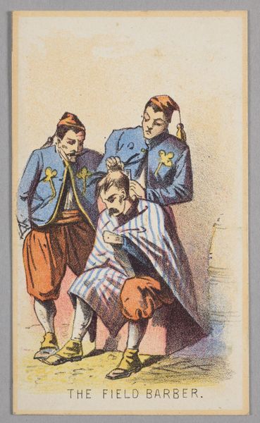 Curator: This piece, simply titled "The Rifle Pit," is an anonymous work, whose dimensions are roughly 10 by 6 centimeters, currently held at the Harvard Art Museums. Editor: The composition is quite striking, especially the textural contrast between the soldier's uniform and the rough, unfinished landscape. There is a clear effort to create depth. Curator: It's fascinating to consider the power dynamics implicit in military imagery. The anonymous nature of the artist allows the figure to stand in for every soldier, inviting a broad interpretation of the experience. Editor: The color palette, though limited, is very effective. Note how the warm tones of the soldier's trousers draw the eye, while the cooler blues and greys evoke a sense of the conflict's bleakness. Curator: Indeed. Viewing this through a postcolonial lens, we might ask whose story this artwork prioritizes, and what narratives are silenced. Editor: Despite the heavy subject matter, the artist uses the line-work, perspective, and figure to convey a strong, singular message to the viewer. Curator: It challenges us to reckon with the human cost of conflict and its enduring legacies, from both sides of the line. Editor: Precisely. An intriguing formal and thematic exploration.
