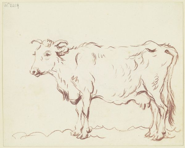 Jean Bernard made this drawing titled 'Standing Cow, facing left' with pen in gray ink on paper. The drawing presents a study in form and line. Bernard employs an economy of strokes to delineate the cow's figure, focusing on its essential structure rather than intricate detail. The lines are delicate yet purposeful, capturing the animal's weight and stance. There is a tension between the realism of the cow's depiction and the abstraction of the lines used to create it. This piece invites us to think about representation itself. It challenges us to consider how much information is needed to convey an image. It reduces the cow to its most basic visual components, making it almost an abstract form. Ultimately, this drawing is a study of how we perceive and categorize the world through visual signs. The essence of the cow is present, demonstrating how a few well-placed lines can evoke a complex understanding.