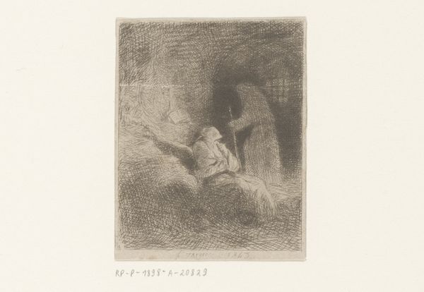 Curator: Charles Jacque created this small etching, "Vrouw met kinderen", sometime between 1823 and 1894. What strikes you when you first look at it? Editor: Intimacy. The huddled figures seem safe and secreted away, even though the scene is rendered with these really active, almost frantic lines. It feels tender, but also maybe a little burdened. Curator: It’s a glimpse into 19th-century rural life, capturing the weight of motherhood, certainly. Genre scenes like this offered a form of social commentary and, depending on the artist's approach, could romanticize or critique those very burdens you’ve described. Editor: It's like a half-remembered dream... or maybe a faded photograph found in an old book. The etched lines almost feel like memory itself— fragile, a little hazy. Do you think Jacque was intentionally going for that ephemeral quality? Curator: Perhaps. Jacque was part of a larger artistic movement that was pushing back against the slickness and grandeur of academic painting. Etchings like these, with their looser style, allowed artists to connect with the public in new ways, showing the unvarnished reality. Also prints made art more widely accessible, no longer exclusive to the elite. Editor: Interesting. I do get a strong sense of empathy for the woman, as if the artist wasn't trying to elevate or diminish her, but just observe and record. There’s such humility here. It resonates still. Curator: Yes, Jacque elevates the everyday. Even with its unrefined style, it speaks to something timeless. And seeing art historical depictions of mothers also reminds us of how, and perhaps how little, the perception of motherhood has shifted through the decades. Editor: True. Makes me think of my own childhood and what that might look like, reinterpreted through the language of etching. A nostalgic art making experiment could be a lot of fun... Curator: Wonderful, thank you for your insightful remarks.