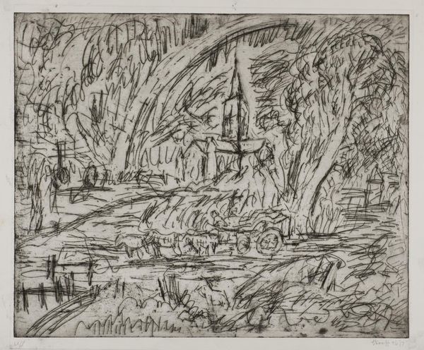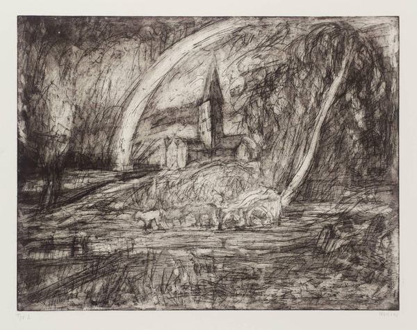 Curator: Here we have Leon Kossoff’s etching, "Salisbury Cathedral from the Meadows (1)." Editor: It’s a storm of lines, isn’t it? Like the cathedral is emerging from a chaotic dream, or being consumed by one. Curator: Kossoff, born in 1926, used etching, a printmaking technique where acid is used to cut into a metal plate, allowing for incredibly detailed work. Editor: You can almost feel the scratching, can't you? I bet the workshop where this print was made was full of the metallic smells of acid and ink. Curator: Exactly! The materials and the process themselves become expressive, reflecting the post-war industrial landscape that formed Kossoff’s worldview. Editor: I see that. I get this sense of resilience despite the chaos. It's both beautiful and uneasy-making. Curator: Ultimately, Kossoff's Salisbury presents an engagement with both process and subject matter. Editor: For me, it's a reminder that even the most solid-seeming things are always in flux, constantly becoming and unbecoming.