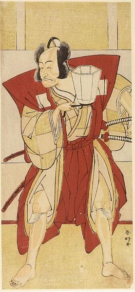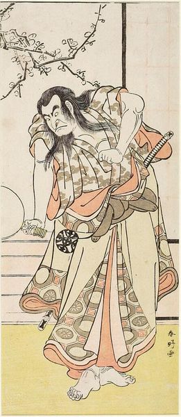 Curator: Look at the striking image of the actor Ichikawa Yaozo as an Otokodate, created by Katsukawa Shunko. The print is on paper and is about 32 by 15 centimeters. Editor: The figure is quite intimidating. I notice the defiant stance, the intense gaze. What's the significance of this Otokodate figure? Curator: It's a character type, a chivalrous commoner, often portrayed as a heroic figure, which reflects the social dynamics of the era. The print itself, being a woodblock, speaks to the methods of mass production and dissemination of such imagery. Editor: I see. The material process allowed for the spread of certain ideals and representations to a wider audience. It makes you wonder how such images shaped perceptions of heroism and masculinity. Curator: Exactly. The labor and skill involved in carving those woodblocks shouldn't be overlooked either. Editor: The careful arrangement of line and color certainly contributes to the overall impression of strength and resolve. This really gives a glimpse into the construction of social identities within art and its consumption. Curator: Indeed, there's much to consider here, beyond just the surface-level aesthetics. Editor: Yes, a blend of artistic skill and societal reflections. It's definitely a piece that encourages further thought.