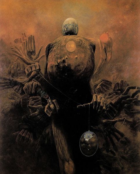 This haunting, untitled painting was made by Polish artist Zdzislaw Beksinski, likely using oil paints on canvas, a traditional medium for fine art. But Beksinski pushes these materials to an unsettling end. Look at the way the paint is layered, creating a murky atmosphere. The faceless figure in the foreground, draped in red, seems both regal and disturbing. The crowd of skeletal figures in the background suggests a scene of decay and anonymity, all rendered with precise brushwork that is both beautiful and deeply unsettling. Beksinski’s meticulous technique contrasts sharply with the bleak subject matter. There is a lot of work in this production process. He challenges our notions of skill and aesthetics. Is it a rejection of traditional values, or a commentary on the human condition? This painting reminds us that even the most conventional materials can be used to explore the darkest corners of the human experience.