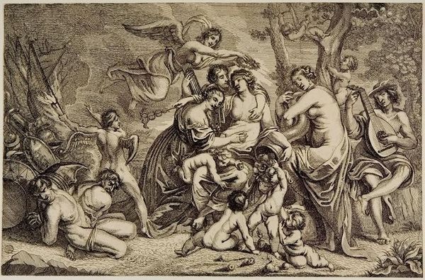 Editor: Here we have an oil painting entitled "Gemeine Jeuchts Beeldt. Allegory of the Temptations of Youth," created sometime between 1598 and 1610. It's currently housed at the SMK in Copenhagen, and the artist is, sadly, unknown. There’s something…chaotic about it. A tussle of bodies and emotions. What's your initial take? Curator: Chaotic is a brilliant way to put it. Imagine stumbling into a rather… boisterous party thrown by your conscience. This painting screams 'Mannerism' – all that elongated drama, a real visual feast designed to both entice and morally instruct, which, let’s be honest, is a tough balancing act! The artist grapples with the age-old battle between virtue and vice. See how the central figure is pulled between worldly pleasures and a more disciplined path? Editor: I see the armored figure now, almost pulling him away, towards… what exactly? And who are all these other figures? Curator: Precisely! The figure in armour likely embodies virtue or reason. It’s a guiding force, urging towards self-control and perhaps salvation, symbolized by the architecture in the distance. And around our… shall we say, ‘struggling’ protagonist are embodiments of youthful temptations: wine, revelry, carnal pleasures. Notice the subtle yet potent expressions, each figure tugging him further into either ecstasy or damnation? Almost like watching your bad decisions unfold in real time, aren't they? Editor: It’s incredibly…busy. So many conflicting pulls, so much detail. It makes the whole thing feel overwhelming, much like temptation itself, I suppose. Curator: And that’s exactly the point! It's designed to spark self-reflection, forcing one to contemplate our choices, asking: who guides our hand when we're faced with temptation? Are we destined to be dragged down, or is there strength in reason? Did anything particularly resonate with you about how this moral crossroads plays out in this canvas? Editor: Definitely how… messy it all is. Good and bad aren't neat categories; they are tangled, which feels honest. I’ll definitely be chewing on this one for a while! Curator: Absolutely. A beautiful, complicated, rather crowded mirror reflecting our inner lives, and really makes you think, doesn’t it? A true testament to human inner conflict and morality, even 400 years on!