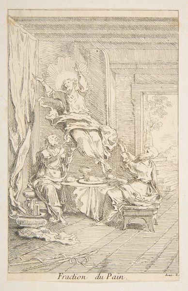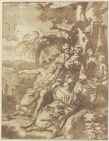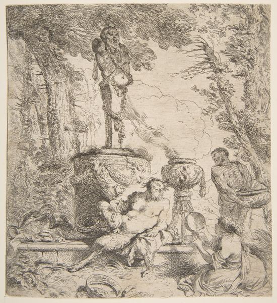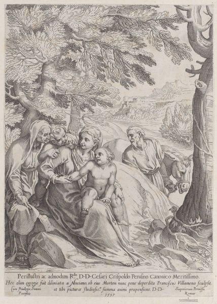 Simone Cantarini created this etching, "The Holy Family Resting on Their Flight into Egypt," now at the Metropolitan Museum of Art. A dominant use of line defines the scene, creating a texture that's both detailed and delicate. Note how Cantarini uses the density and direction of the lines to model forms and create shadow. This technique infuses the scene with a sense of depth. The composition, grouping figures closely together in the foreground, draws our eye to the intimate moment of rest during their journey. The angel plucking dates from the palm tree both protects them and provides sustenance. Cantarini uses the formal structure to convey deeper meanings. The lines create a visual framework that invites contemplation of themes like divine protection and the human experience of the Holy Family. The very materiality of the etching, with its stark contrast of light and shadow, serves to highlight the spiritual weight of the scene.