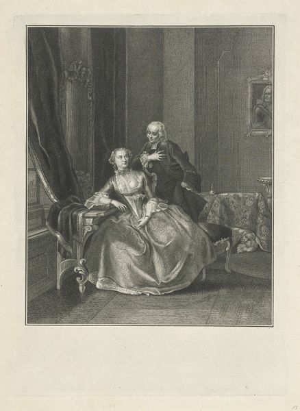 Cornelis Troost painted "Unseemly Love" in oil on canvas, capturing a scene of intimate exchange within a domestic interior. The composition balances the dark tones of the gentleman's attire against the soft, illuminated dress of the woman. This juxtaposition creates a visual tension, drawing our eye across the tableau. Troost masterfully employs light and shadow to define form and space. The chiaroscuro effect not only adds depth but also hints at underlying psychological complexities, playing with themes of appearance versus reality. Note how the precise rendering of details, like the intricate patterns on the wall and the textures of the fabrics, contribute to a semiotic system of signs that invite interpretation. The painting destabilizes conventional notions of virtue and decorum. Through formal analysis, it becomes clear that Troost is engaging with broader cultural critiques of his time, challenging viewers to question the surface narrative. We are left to ponder what other readings can be gleaned from this rich image, seeing art as a dynamic and ever-evolving discourse.