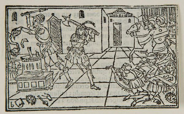Editor: This is an anonymous print titled "Book I.58. Sextus Tarquinius rapes Lucretia," and it depicts a rather disturbing scene. What stands out to you about its historical and cultural significance? Curator: The starkness of the woodcut emphasizes the brutal act itself, stripping away any romanticism. Consider the labor involved in creating such a print; each line carefully carved, each impression a repetition of power dynamics and the consumption of this narrative. How does the medium itself contribute to our understanding of the event? Editor: That's a powerful perspective. I hadn't considered the physical act of creating the image as part of the story. Curator: Precisely. The print becomes a commodity, circulating and reinforcing societal views on gender and violence. Editor: I see. Analyzing the means of production gives the image another layer of interpretation. Thank you! Curator: Indeed, examining the materiality provides valuable insights!