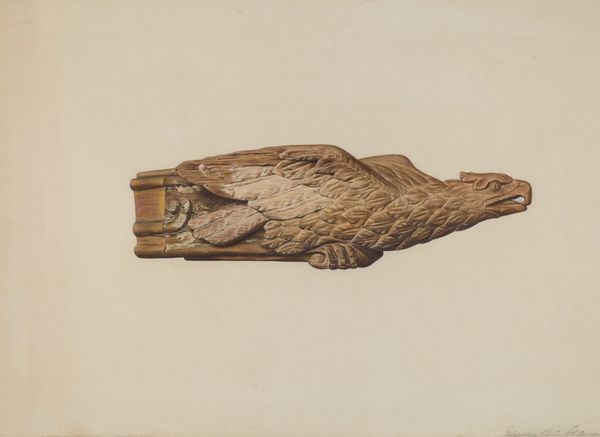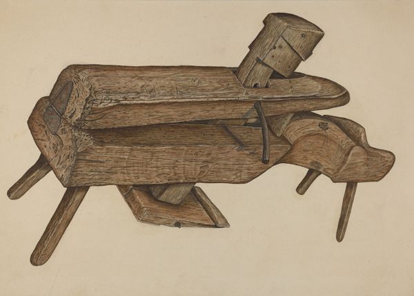 Editor: This is Samuel Faigin’s *Hollow Plane*, created around 1937 using pencil and watercolor. There’s a quiet beauty to this meticulous rendering of a common tool; it feels almost reverential. What jumps out at you when you look at it? Curator: You know, it's interesting you use the word 'reverential.' I find myself immediately wondering about Faigin's relationship with this plane. Was it a beloved tool passed down through generations? A symbol of his own craft? Or maybe he just had one kicking around his studio. Editor: A symbolic, beat-up hand-me-down—I like that thought. The details feel so personal. Curator: Exactly! It feels like the object has been carefully selected, stripped bare, and immortalized on paper. I wonder about the way he isolated the object, removing all the context. What statement is the artist trying to make about the significance of the most humble instrument? Editor: I guess it invites us to pause and see beauty in the everyday? The grain of the wood looks so tactile, even in a drawing. It definitely slows me down. Curator: Me too. I almost feel like I could pick it up and put it to use. And that little "blueprint" of the blade shape down in the corner feels like a tender nod to the craftsmanship embodied by this tool. Editor: Seeing your excitement has changed the way I see the image. The pencil and watercolor somehow soften this otherwise hard object and make me think about how the artist really looked at, rather than simply glanced at, something so commonplace. Curator: And sometimes, that's enough. Shifting the way you look at everyday objects around you!