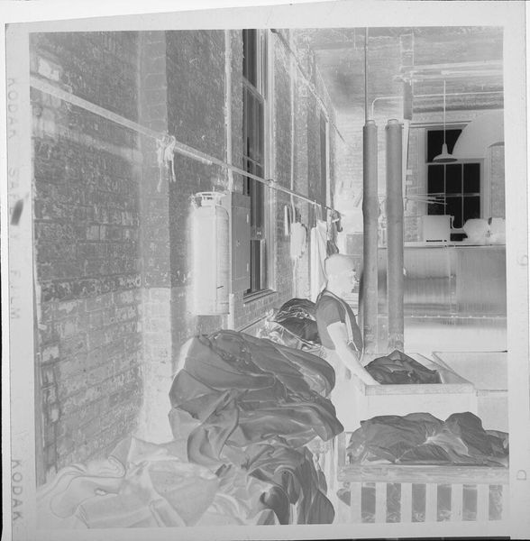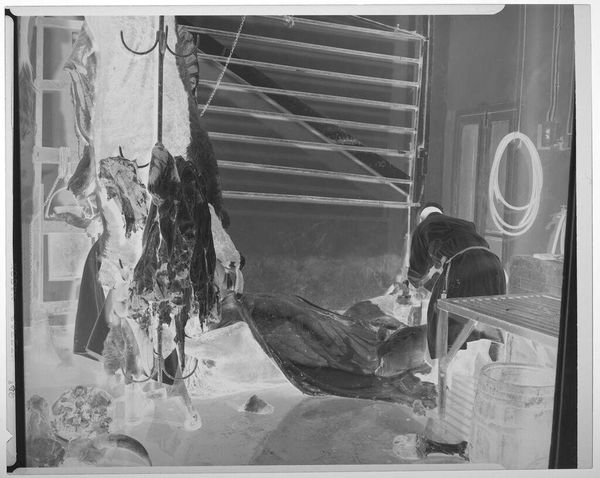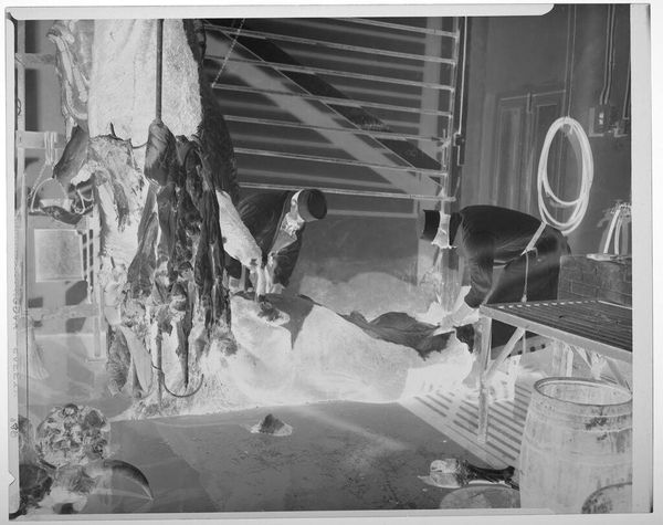 Curator: This is an untitled photograph by Harry Annas, depicting men working with carcasses in the Kreuzberg market. Editor: The stark composition immediately evokes a sense of industry and also something slightly macabre. Curator: Absolutely, the image shows the processes of labor, raw materials transformed into commodities, hinting at the social contexts surrounding food production and consumption. Editor: The carcasses themselves, rendered in such detail, are more than just meat; they symbolize mortality and our complex relationship with sustenance. The market setting adds layers of cultural and historical significance, reflecting local traditions. Curator: The photograph certainly captures the physical labor involved, underscoring the materiality of the work and the workers’ relationship to the environment. Editor: The stark black and white palette intensifies the emotional impact, reminding us that this scene, though specific to a time and place, taps into universal themes of life, death, and the human condition. Curator: It makes one consider the role of marketplaces in shaping our societies. Editor: Indeed, and the symbolic weight tied to our most fundamental needs.