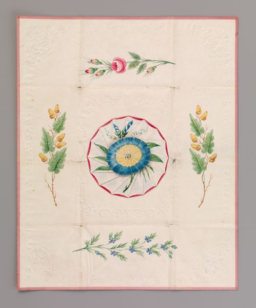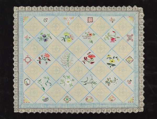 Editor: Here we have an 18th-century German pillow cover. It’s an anonymous piece, made from silk and other textile materials. The pastel colors are so delicate. What strikes you most about this work? Curator: Thank you. Considering the pillow cover’s creation within the 18th century, a time marked by rigid social hierarchies, I find myself contemplating the unspoken narratives embedded in its very fabric. Do you notice how the repeated floral motifs, though seemingly benign, create a meticulously ordered surface? Editor: Yes, the pattern is quite symmetrical. Curator: Exactly! This symmetry reflects the desire for order and control so valued in that era. Think about the lives of women during this period. Needlework, like the hand-embroidered designs we see here, was not merely a pastime. It was a carefully monitored expression of domestic virtue and social standing. The silk threads, the intricate stitches, all speak to a culture where a woman's worth was intricately tied to her ability to create beauty within the confines of her home. What do you think about that domestic confinement? Editor: I never thought about it that way! It's easy to just see a pretty pattern. It makes you wonder who made this, and what her life was like. Curator: Precisely! By analyzing these seemingly simple motifs through a feminist lens, we start to uncover a dialogue about agency, confinement, and the subtle ways women navigated their roles in a patriarchal society. The decorative can become deeply political when viewed within its historical context. Editor: I'll definitely look at textiles differently now. Thanks so much. Curator: My pleasure. Remember, art is never created in a vacuum. It's always reflecting, reinforcing, or even resisting the norms of its time.