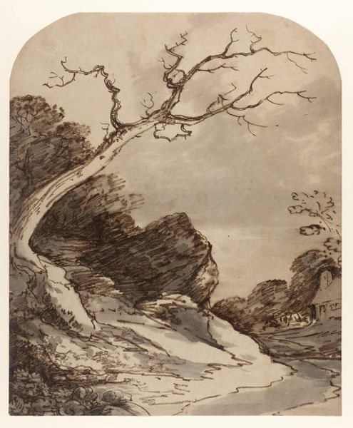 Curator: Immediately, I notice how muted the overall effect is; the sepia tones create a world that feels both inviting and distant. Editor: Indeed. This is "The Pupil’s Interpretation of a Blot, Based on New Method, Plate 10" by Alexander Cozens. The piece, which resides here at the Tate, demonstrates Cozens's innovative approach to landscape drawing. His method relies on accidental ink blots as the genesis for compositions. Curator: The fact that Cozens based his landscapes on blots is so interesting! It emphasizes the role of chance and the subconscious in artistic creation. We can see him trying to subvert the traditional artistic process. Editor: Absolutely. Consider, too, that in the late 18th century, ideas about the sublime and picturesque heavily influenced landscape art. Cozens challenges the rigid aesthetic hierarchy by embracing randomness. Curator: The paper support itself is fascinating too. It allows us to see the texture and understand the labor involved in producing this artwork. Editor: It’s a powerful reminder of the socio-historical context that shaped artistic practices then. Curator: It certainly expands my perspective on the art of landscape. Editor: And it invites reflection on how we construct meaning and find beauty in the unexpected.
