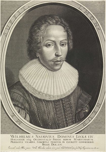 Curator: So, here we have "Portret van Willem van Nassau-LaLecq," an engraving, dating from around 1840 to 1884, here at the Rijksmuseum. Quite striking, isn't it? Editor: My eye immediately goes to that elaborate ruff! It's like a paper sculpture surrounding his face. Makes you wonder about the labour involved in such meticulous detail, doesn't it? Curator: It does. The artist, Jan Frederik Christiaan Reckleben, really captures a sense of... gravity, maybe? There's a weightiness to his gaze that transcends the period fashion. It whispers tales of inherited power. Editor: Absolutely. Look at the material quality achieved here; that is the key, wouldn't you say? All those minute etched lines bringing a whole social structure to life, almost palpably so. Think of the engraver's labor, the repetitive, almost meditative action involved. This portrait is less about individual likeness, and more about class performance frozen into a print meant for wide consumption. Curator: That’s astute. And there’s something almost playful in the presentation despite its formality; his expression is so gentle and unthreatening. Editor: Playful? The stern facial features combined with the excessive sartorial display speaks to the function of the piece within the circuit of power and image. Curator: Yes, and also look at the inclusion of his coat of arms just beneath the portrait. It seems to add authenticity or, dare I say, approval, from higher entities! How do we respond to heraldry like that today? Editor: Well, historically, these printed portraits helped solidify social hierarchies, reinforcing the status of families. How different is this production from our modern modes? What's fascinating is tracing the line between old-world prestige and our age of viral imagery, and how wealth continues its parade across our various material fields, but maybe that's a too far afield. Curator: Not at all. In fact, that tension between permanence and fleeting image is precisely what keeps it so fascinating! We may smirk at the frills, but the drive behind the display, I think that still resonates. Editor: Exactly! Looking beyond the portrait reveals volumes about systems of image creation and their consumption. That is the historical lineage, not the man, that fascinates me most.