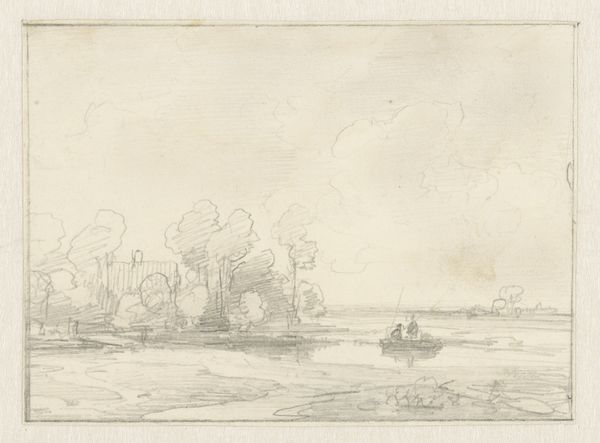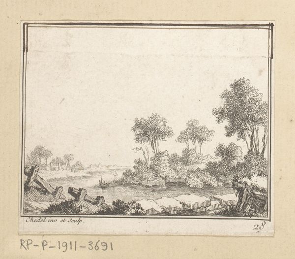 Editor: We're looking at "Landschap met boerderijen, gezien vanaf het water," or "Landscape with farms, seen from the water," an etching by Christian Wilhelm Ernst Dietrich, created in 1742. There's a serene stillness about it. What can you tell me about this landscape? Curator: Dietrich's choice of subject aligns with the 18th-century's burgeoning interest in the picturesque. How does the landscape contribute to a sense of national identity or belonging during this period? Was Dietrich trying to evoke nostalgia, or create a sense of familiarity among audiences who were increasingly urbanizing? Editor: That’s fascinating. I see it as just a peaceful scene, but thinking about the social changes makes me consider it in a completely new light. It almost feels like an idealized version of the countryside, especially for people moving into cities. Curator: Exactly. Think about the rise of landscape prints and paintings; they weren't just about aesthetics. They were about power, ownership, and even constructing a national narrative. The art market increasingly catered to a burgeoning middle class wanting access to cultural capital. What role did institutions like the Rijksmuseum play in legitimizing certain narratives about national identity and artistic heritage? Editor: So, a simple countryside scene becomes part of this much larger cultural and political conversation. How incredible! I suppose it goes to show how even seemingly innocuous artwork carries cultural weight. I definitely see this print differently now.
