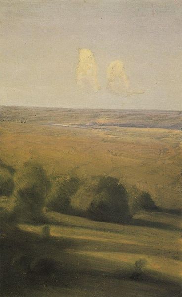 Curator: Standing before us is "Evening," a watercolor on paper created by Caspar David Friedrich around 1824. It's currently housed at the Kunsthalle Mannheim. Editor: The first thing that strikes me is its softness. That dreamy quality comes, I imagine, from the watercolour, which has a beautifully uneven wash effect on the paper. Curator: Indeed. Friedrich, deeply involved with Romanticism, often used light to convey spiritual experiences. Notice how the soft yellows and blues create an almost transcendent mood. The colours used are important when one remembers his intention, his message. Editor: It looks as though he has deployed plein-air to observe the subject with spontaneity. It has a subdued palette with no brilliant color at all. I want to know how Friedrich manipulated the watercolor to get such delicate tones; perhaps thinning the washes? Curator: It evokes a longing, doesn’t it? Think about the symbolism of the sunset itself; its use speaks to mortality, the fleeting nature of time, which was often on Friedrich's mind as he recovered from numerous episodes of depression. Editor: Subdued and humble material application here! One wouldn’t call the artist a watercolour master compared to say, Turner. Yet, somehow that amateur handling makes the light effects seem sincere. The level horizon feels weighed down. Curator: Remember, for Friedrich, landscape wasn't just about accurately depicting nature. It was about reflecting the inner emotional and spiritual landscape of humanity. Each visual element he deploys, from the vast sky to the dark foreground, it’s all symbolic. It speaks volumes. Editor: Perhaps Friedrich was choosing humbler tools like watercolour because he believed it enabled him to observe nature directly, and translate impressions sincerely through portable plein-air sketches like this, thus short-circuiting academic tastes? Curator: Yes, a plausible scenario. I'm intrigued about how the piece creates such a sense of calm resignation. Editor: Me too. Those horizontal streaks really accentuate how far he was removed from Academic expectations. Thank you.