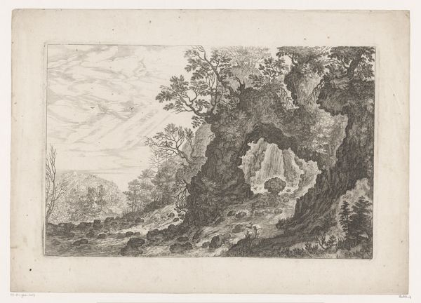 Curator: This pencil drawing, “Rocks with Bushes,” was created around 1820 by Hendrik Voogd. At first glance, it is a detailed study of rock formations, revealing the artist's careful observation. Editor: It strikes me as austere, almost bleak. The starkness of the rock, rendered so meticulously, gives off a sense of nature's indifference. There's no human presence, no story. It feels... isolated. Curator: That isolation, I believe, is key to understanding its cultural moment. The Romantic era artists were turning away from depictions of society to reveal sublime truths about raw nature. The rocky setting has a symbolic resonance with classical ideals, alluding perhaps to notions of perseverance or timelessness. Editor: Perhaps. But isn’t that sublimation of the personal, that retreat into "untouched" nature, often a privilege? Who gets to define 'untouched,' and whose perspectives are silenced in that definition? I see these "objective" landscapes as bearing a heavy social encoding. Curator: Interesting point. The artist did intend to present a realistic interpretation of form, certainly in keeping with the values of realism emerging within the romanticism style. It would invite the viewer into meditative consideration. Editor: I read the darkness of those rock crevices differently, like nature swallowing narratives rather than celebrating them. The lack of vibrant color and life almost feels oppressive, evoking a sense of restriction, particularly the rigid frame around the entire piece that creates this distinct foreground/background tension. How might Voogd's work, and its legacy, have suppressed the realities of marginalized groups? Curator: It's an intriguing lens through which to view Voogd's piece; it challenges traditional interpretations by weaving social concerns into art history. Editor: Exactly, prompting us to engage not only with Voogd's skill, but the larger socio-political structures that dictated what and who were deemed worthy of representation, whose views remain unseen in these "objective" studies. Thank you for guiding me on a journey of form and emotion. Curator: And thank you for encouraging me to see past aesthetic beauty to a more inclusive representation.