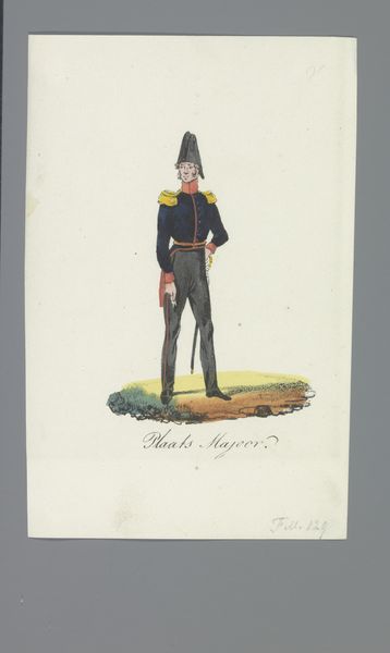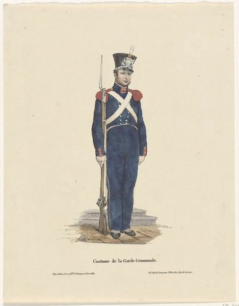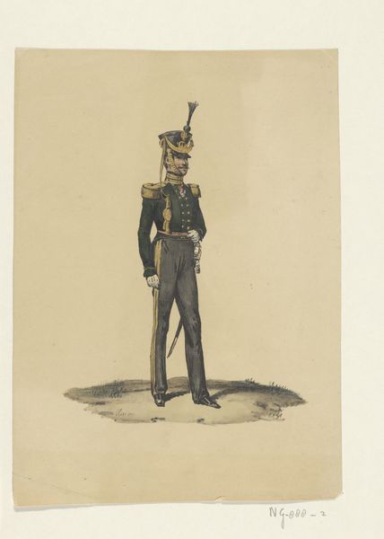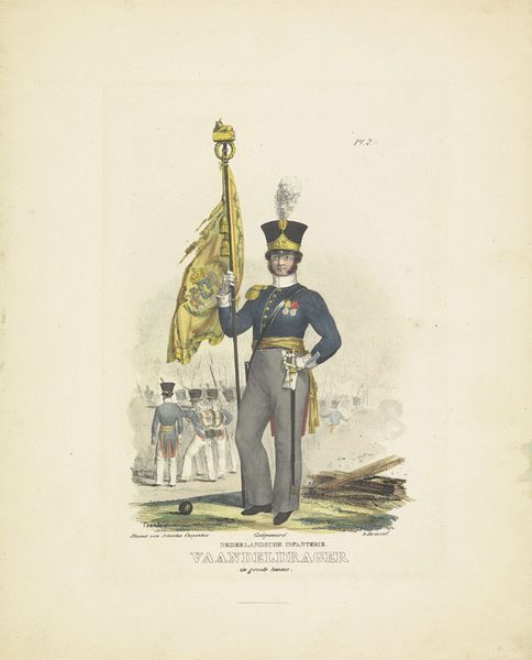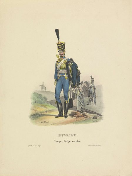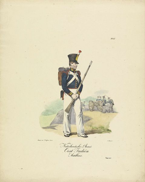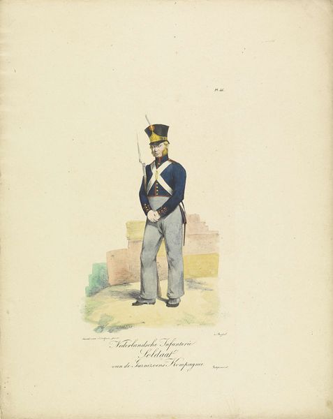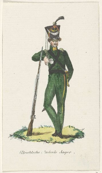 This print of a ‘Jager in grote tenue’ was created by De la Cour between 1820 and 1825. Its medium, printmaking, is critical to understanding its purpose. The crisp lines and flat colors suggest a process of lithography, a relatively new technology at the time. This method allowed for the relatively quick reproduction of images, making them accessible to a wider audience. Consider the social context. The print depicts a soldier in full dress uniform, a symbol of power and order in the post-Napoleonic era. Lithography, in this case, serves the purpose of disseminating an image of military authority. The level of detail suggests it may have been a source of information for tailors, for example, or military enthusiasts. Ultimately, this print reveals how a specific technology, lithography, was used to propagate images of social importance, blurring the lines between art, information, and political messaging.