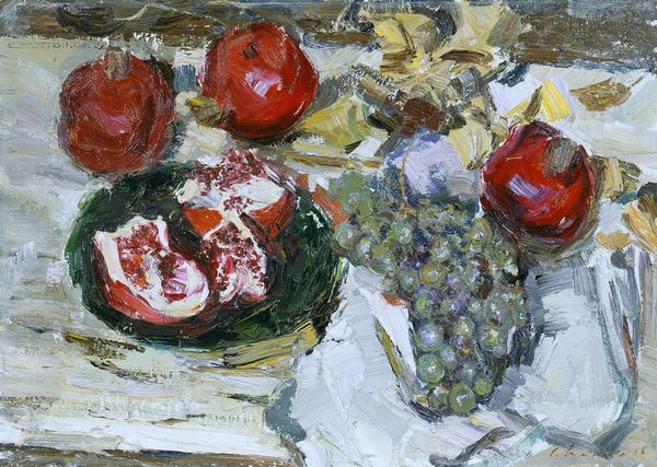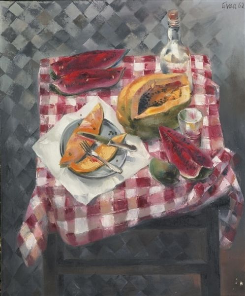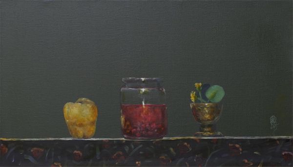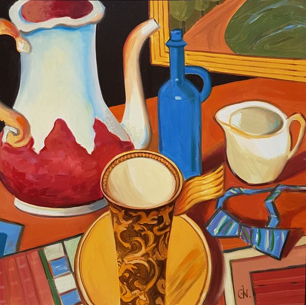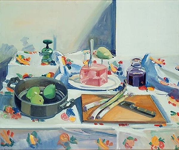 Janet Fish made this still life painting called 'Herb Tea' with oil on canvas. It's so interesting to see how she handles this busy table top; each object distinct but unified by the way the light catches and distorts everything. The surface is smooth, you can barely see the brushstrokes, which kind of obscures the process, but it's also very controlled and assured. The colour palette is fascinating – soft pinks and oranges contrasting with the cool, almost metallic grays of the shadows. I find my eye drawn to the plastic bag and lemon, which is rendered so beautifully. The transparency of the bag is captured with such subtlety, it feels almost real, yet it's clearly paint. Fish’s work reminds me a bit of Giorgio Morandi, in the way that both artists focus on simple, everyday objects. But where Morandi is muted and contemplative, Fish is vibrant and energetic. Both artists show us that the ordinary can be extraordinary when seen through the eyes of a painter.