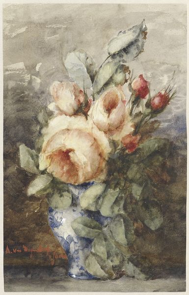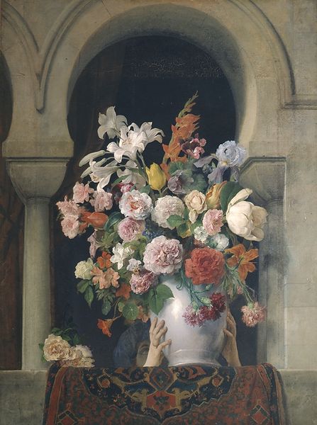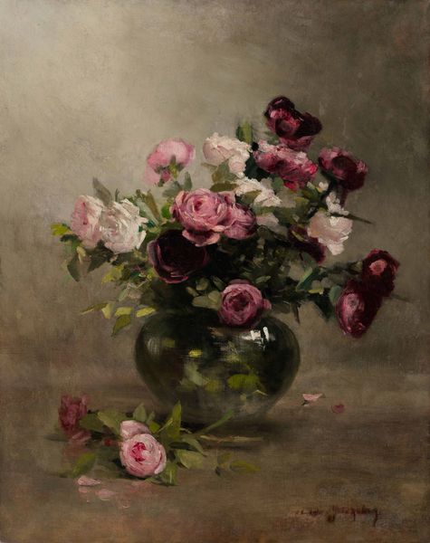 John La Farge created this oil on canvas painting, "Flowers on a Window Ledge," using soft brushstrokes and a muted palette to evoke a tranquil and intimate scene. The eye is drawn to the careful placement of the floral arrangement, with its subtle variations in color and form set against the stark geometry of the window ledge. The composition invites us to consider the interplay between interior and exterior spaces, mediated by the translucent curtain. The structure is such that the flowers appear to be a bridge between the immediate, tangible space of the windowsill and the distant, blurred landscape beyond. The artist destabilizes the traditional still life, blurring the boundary between the crafted arrangement and the natural world, introducing a dialogue about artifice and reality. The subdued tones and hazy atmosphere serve not only aesthetic purposes but also reflect a broader artistic and philosophical concern with perception and representation. This is a space where the transient beauty of nature is framed and contemplated, inviting ongoing interpretation and re-interpretation.