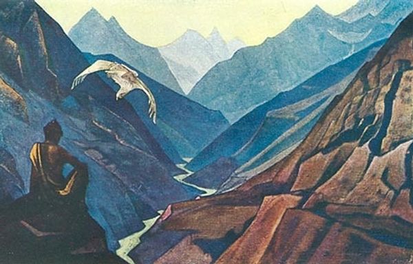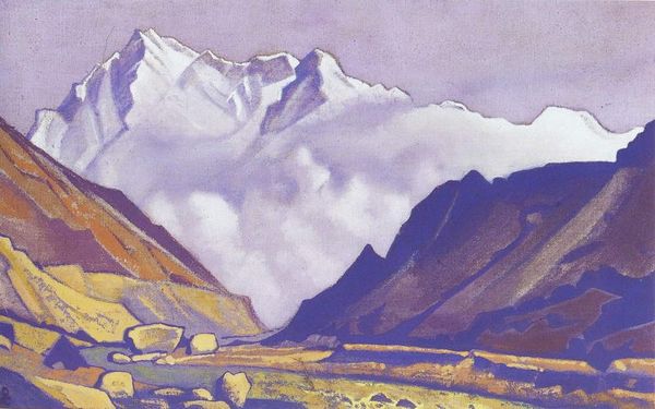 Curator: Looking at this painting by Nicholas Roerich titled "Gumran," completed in 1932, the first thing that strikes me is this almost otherworldly quality. It feels both ancient and futuristic, doesn't it? Editor: Yes, absolutely! And what a masterful display of the mineral-rich pigments, these distinct strata. You know, it's fascinating how he deployed oil paint here, in a very particular way…it has me wondering if Roerich prepared his own pigments; what sources did he have access to during this time in his career? Curator: I wonder, too, how much the materials he chose shaped his style, his almost dreamlike presentation. He truly seemed to paint what he felt, the way those angular, overlapping planes rise towards a cloudy, yet vivid, sky—all suggesting this heightened state of consciousness. The sky appears touched, perhaps, by divinity. Editor: Divinely sourced pigments maybe? It's not just aesthetic; it's geographic, political even. Consider the Himalayas as not just subject but also a raw material supply chain of mineral pigment. Did the accessibility or trade routes dictate the palette? Roerich worked across shifting landscapes, not only pictorially but also geo-economically! It affects composition, tone, the actual physicality of the painting... Curator: What’s so powerful to me is this tension Roerich establishes. It's grounded in earthly materials and production as you mentioned, yet those sharp peaks feel somehow symbolic. That’s why this feels almost timeless—his paintings seem to whisper forgotten histories, legends, visions. The soul seems more real to him than any surface reality. Editor: Well, those "visions" have always material preconditions! I can appreciate how "Gumran" transports the viewer, but without proper labor, trade, material knowledge it stays on that lofty, inaccessible peak. It’s essential we consider what and *who* enabled that symbolic language! Curator: Indeed. Understanding how the art itself becomes shaped, so intricately woven within, provides a pathway to grasping it more intimately, which perhaps brings it to a higher level of appreciation. Editor: Absolutely! Now when I gaze upon that mountain I'm equally contemplating landscape, labor, pigment origins—all coexisting! What once appeared transcendental seems much more grounded!