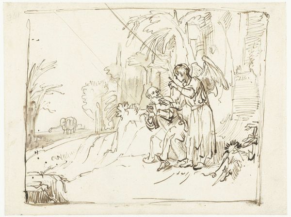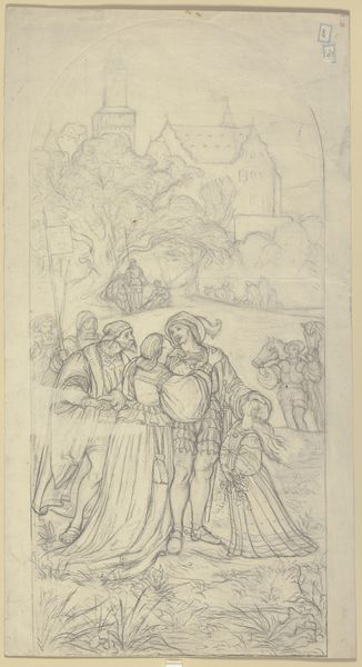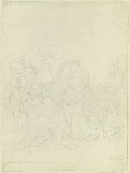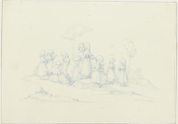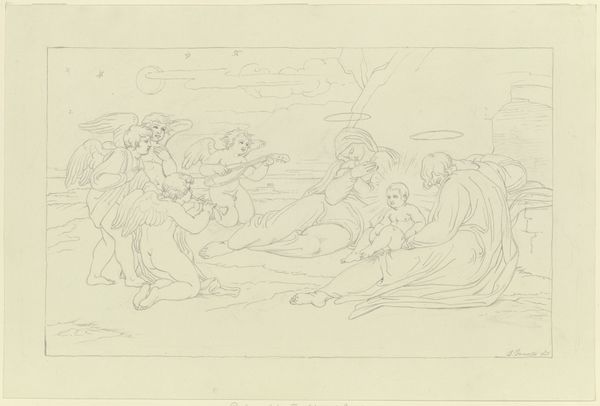 Karl Sandhaas created this drawing of angels and children at the gate of paradise using graphite on paper. The immediate impression is one of lightness, even ethereality, which relates directly to the materials used. Sandhaas has employed a minimal approach, using only the most basic of tools: graphite, which is essentially just carbon, and paper, a relatively inexpensive and readily available material, to create a celestial scene. The artist's marks are delicate and precise, requiring an immense amount of skill and control to create the soft, diffused light. Each line builds the forms, creating a sense of volume and depth with sparse strokes and layers of shading. It's important to remember that in Sandhaas’ time, the handmade was still dominant. His labor-intensive process, and the way the drawing captures a spiritual subject, elevate this humble artwork beyond its modest materials. By considering the handwork involved, we can appreciate Sandhaas' drawing for the depth of expression achieved through simple means.