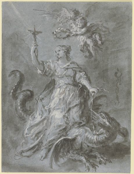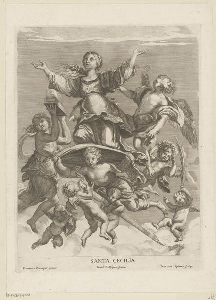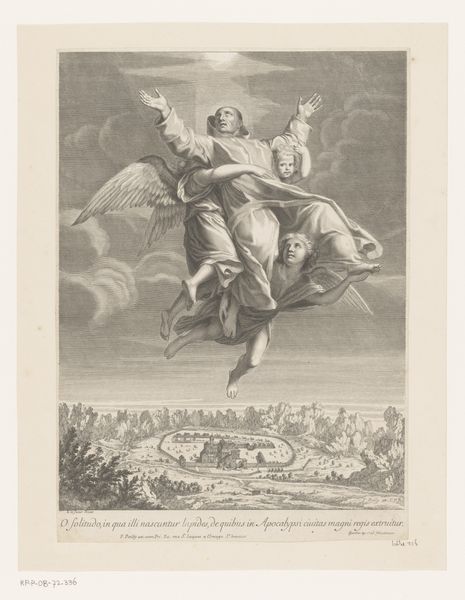 Nicolas de Larmessin III created this print, Maria-Tenhemelopneming, using engraving. This image depicts the Assumption of Mary into Heaven, a popular subject during the Baroque period, particularly in Catholic countries like France, where Larmessin lived. We can consider it within the context of religious institutions and the powerful role the church played in shaping cultural values. The visual codes in the image, such as the upward gaze and outstretched arms of Mary, as well as the presence of angels, are familiar from religious art across Europe. What might be less obvious is the way these visual codes were used to reinforce religious doctrine during a time of social upheaval and religious conflict. The print could be seen as a conservative statement, reaffirming traditional beliefs in the face of new philosophical ideas brought forward during the Enlightenment. To understand this print more fully, we can look at theological texts, art criticism, and social histories of 18th-century France, allowing us to understand the complex interplay between art, religion, and society.