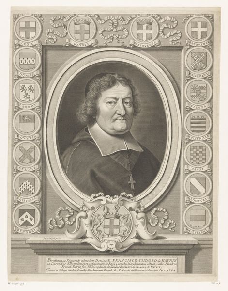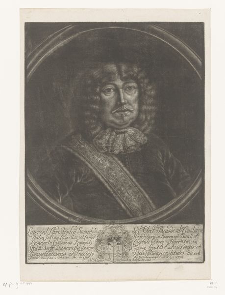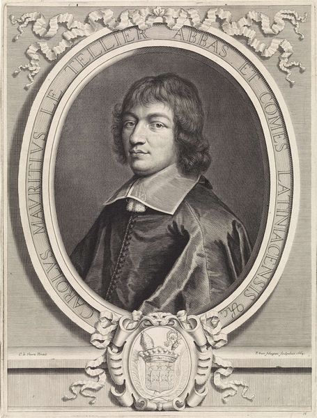 Curator: This is Nicolas de Larmessin’s 1681 engraving, “Portret van Charles-Maurice Le Tellier,” now held at the Rijksmuseum. The work presents us with an intriguing figure, Charles-Maurice Le Tellier himself. Editor: It's a classic Baroque portrait—stern and composed. The tight oval composition and detailed linework create a striking visual tension, especially in the play of light across the subject's face. Curator: Indeed. Larmessin, part of a family dynasty of engravers, created this portrait as part of a larger series of prominent figures of the time. Consider the status of printmaking back then. This wasn’t merely decorative, but a crucial form of disseminating imagery and reinforcing social hierarchies. Le Tellier, as Archbishop and important political figure, embodies that power structure. Editor: I agree about the importance of prints but would also highlight Larmessin's technical skill. The variations in line thickness create convincing tonal shifts, giving Le Tellier's robes a sense of luxurious weight and texture, quite a remarkable feat using only line. The rendering of the lace collar and the hair is superb. Curator: Absolutely. These details served specific ideological functions. Baroque art served as propaganda. Here, Larmessin employs conventional symbols – the ribbons, the coat of arms – which project Le Tellier’s authority and legitimize his position. Editor: And even the formal frame functions within this structured visual vocabulary of the period, underscoring his place within a system of power. It encapsulates him as if an exhibit—objectified and contained. The details pull you into examining all that represents a Baroque leader in detail. Curator: I’m struck by the historical resonance this work possesses. These prints give us access to people who shaped political policies of the time. They allow us to imagine the society which this man not only moved around but also shaped. Editor: Ultimately, it’s the convergence of visual skill and societal record that allows us to regard such Baroque portraits today.