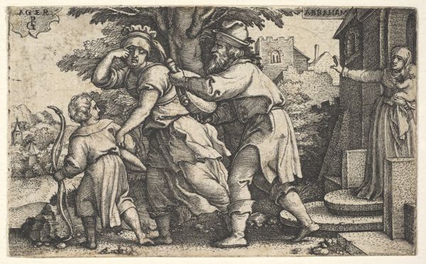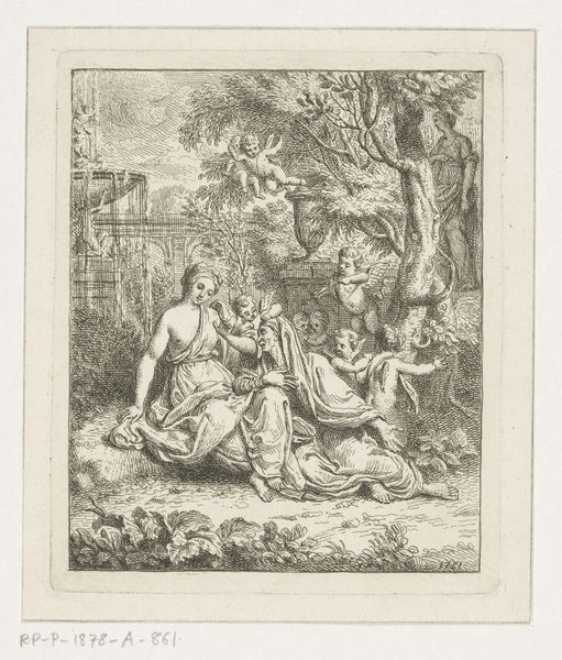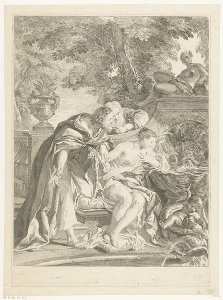 Curator: Look at this serene, classical scene. This engraving, titled "Vertumnus and Pomona", was created sometime between 1600 and 1670 by Frederick Bloemaert. Editor: It’s dreamlike. Almost hazy with all the detail, like trying to recall a half-remembered myth. The light and shadow are really doing something to me, drawing me into the garden. Curator: Absolutely, the engraving medium allows for incredibly fine detail, contributing to that sense of lushness and depth. It's currently held here at the Rijksmuseum. Bloemaert was working within the Baroque style here, and it clearly references Ovid's "Metamorphoses." We see Pomona, the goddess of fruit trees, and Vertumnus, who disguises himself as an old woman to win her over. Editor: Ah, so the crone IS Vertumnus! I’d initially thought the younger figure held some kind of authority over the older woman, but that disguise adds a clever, subtle layer of irony to the whole scene, don't you think? Curator: Precisely. Bloemaert is playing with power dynamics and deception through a lens of classical mythology. Note how the formal garden in the background acts as a symbol for cultivated desire. And while it fits squarely into the established Baroque art market, Bloemaert, working largely as a printmaker, likely was trying to reach a wider audience than other painters who produced single, expensive oil paintings. Editor: Well, even today, you can still feel the human condition bubbling to the surface here—we all hide pieces of ourselves to connect with others, right? That story continues to speak to me in this gorgeous old engraving. Curator: Yes, and that tension, the private performance versus the public self, plays out quite compellingly here within the confines of the print. Editor: What a delightful paradox to hold in a single image. Makes you wonder what other secrets are waiting to be revealed with each viewing. Curator: Indeed. I'm grateful that you were willing to point out its emotional appeal as well, rather than only addressing its historical background. Editor: The pleasure was all mine! Let's go unearth our next adventure.