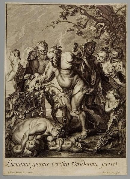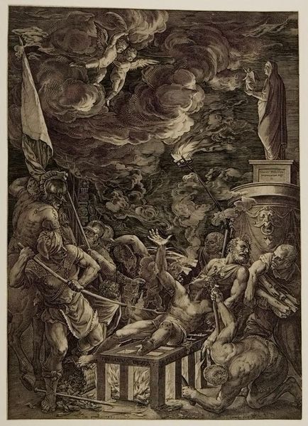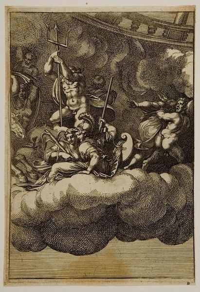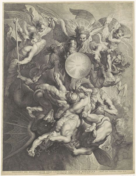 Editor: Here we have Jacob Neeffs' "Saint Michael," made sometime in the 17th century. It's a chaotic scene! What symbols stand out to you in this depiction? Curator: The clash of angels and demons carries immense symbolic weight. Note how Saint Michael wields his shield—a visual representation of divine protection and righteousness. Observe too, the grotesque faces of the fallen angels: distortions of what was once beautiful. Editor: So the distortion reflects their corruption? Curator: Precisely. It's a potent cultural memory, isn't it? A reminder of the eternal struggle between good and evil, and the psychological consequences of straying from divine grace. Editor: I see it now—the emotional power in those distorted images. Thanks!