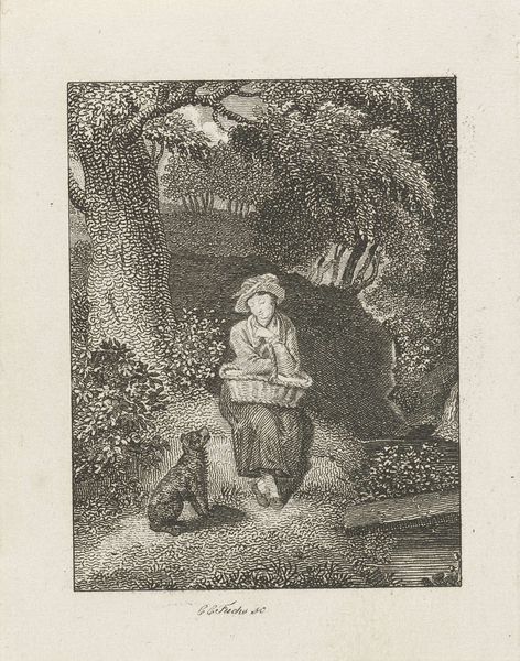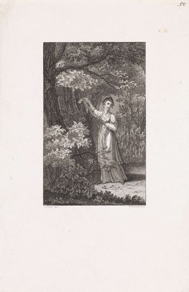Reinier Vinkeles made this print of a forest scene with a woman seated on a tree trunk, sometime between 1741 and 1816. It's a delicate work, made using engraving, a printmaking technique that requires immense skill and patience. The process begins with a metal plate, usually copper, into which the artist carefully carves lines using a tool called a burin. These lines become grooves that hold ink. The plate is then inked, and the surface wiped clean, leaving ink only in the incised lines. Finally, paper is pressed against the plate, transferring the image. This print shows the artist's mastery of the technique, with fine lines creating subtle gradations of light and shadow. It invites contemplation on labor, skill, and the cultural value we place on handcrafted images in an age of mechanical reproduction. Considering the materials, the making, and the social context helps us appreciate the full meaning of this beautiful print, challenging our traditional ideas about art and craft.