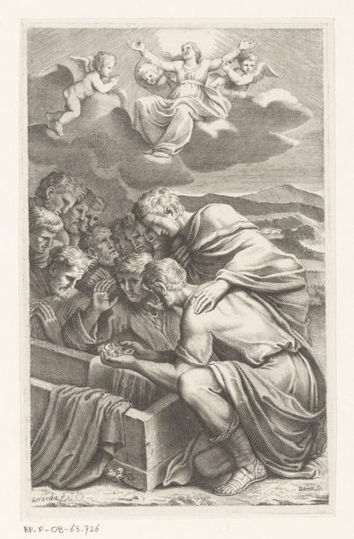 Curator: This is an engraving by Michel Lasne, made between 1617 and 1620. It's titled "The Vision of Saint Francis, kneeling at right, receiving the Christ child from the Virgin Mary". Editor: My first thought is just how dynamic it feels, especially for an engraving. The rays of light really pull your eye upward through the scene. The poses also suggest movement despite the static nature of the medium. Curator: The figure of St. Francis is particularly compelling. Lasne captures him kneeling in awe, receiving the Christ Child directly from the Virgin Mary. We often see St. Francis depicted with symbols of the stigmata, yet here, his moment of profound spiritual connection is emphasized instead. Editor: It’s striking how this image attempts to humanize these figures. Francis looks less like a distant saint and more like a working-class man deeply moved by this experience. What social messaging do you think images like this were trying to send? Curator: Religious iconography was, after all, a means of shaping the social consciousness. The image acts as an example of humility, as seen through St. Francis. There is also an implication of divine intervention and grace as the path to individual salvation. Note the angels in the clouds, figures traditionally associated with divine communication and protection, watching over them. Editor: Right, and by depicting this very human exchange, it creates a relatable framework for piety, doesn’t it? This work moves away from depictions of opulence within the Church, a clear turn toward direct engagement with the divine for a broader population. It serves to illustrate, quite literally, a connection to something greater than the individual experience. Curator: Absolutely. Lasne is invoking not just the historical narrative of Saint Francis, but also a message about the individual's potential for accessing divine love and grace directly. Editor: Thinking about Lasne's "Vision of Saint Francis" has me pondering what access to the divine looks like now. Do we see examples of connection in contemporary art? Curator: Perhaps artists are today more concerned with showing what breaks us from achieving that connection: the things that come between us and whatever sense of "divine" we can still conjure.