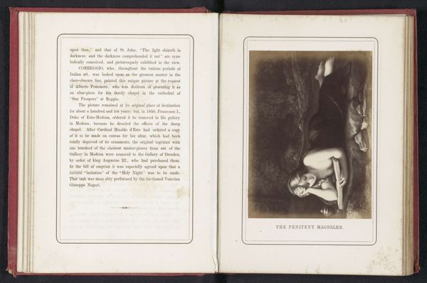 This is a photogravure by Hanns Hanfstaengl, reproducing Pompeo Batoni's painting of Mary Magdalene. The composition is dominated by the figure of Magdalene in the desert. Note how the dramatic use of light and shadow carves out the figure from the dark, cavernous background. The chiaroscuro emphasizes a sense of depth, drawing our eye to the interplay between light and shadow on Magdalene's form. Batoni employs a restricted palette to heighten the emotional impact of the piece, evoking feelings of isolation and penitence. The figure's anguished posture speaks to her internal torment. The artist uses the visual language of baroque drama, but reinterprets this to portray psychological depth rather than theatrical spectacle. The photogravure, through its tonal range, seeks to replicate the texture and depth of the original painting, engaging in a dialogue about representation and reproduction, and how it can challenge our perception and understanding of the original artwork.