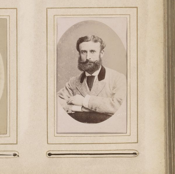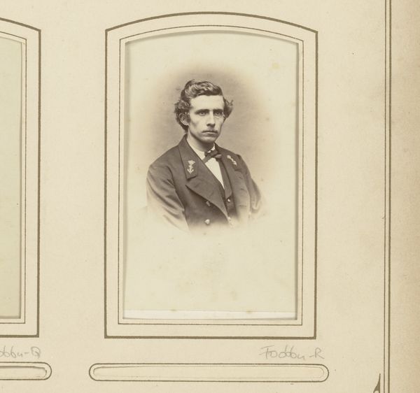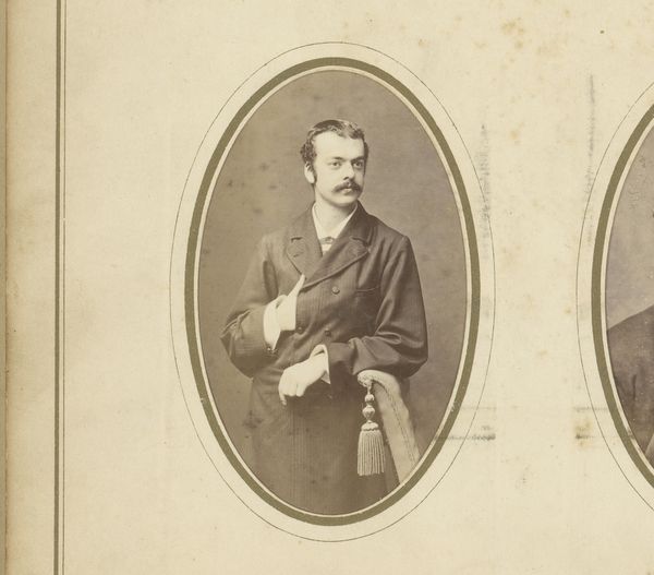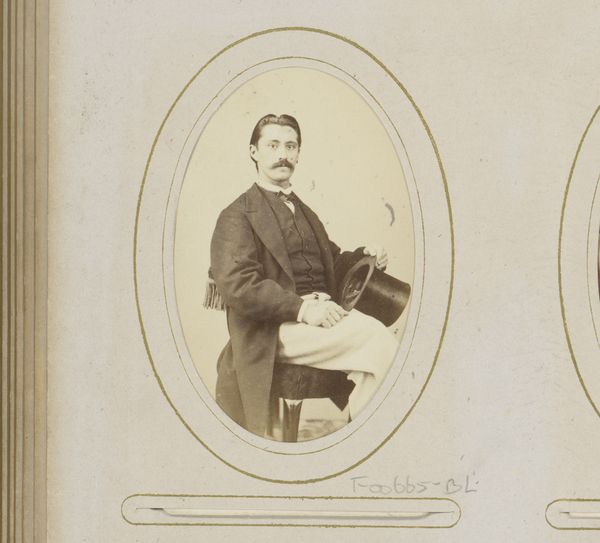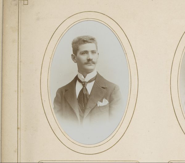 This small portrait, made by J.B. Jasper, presents a man in light clothing, neatly framed in an oval shape. The sepia tones and the careful arrangement of the figure evoke a sense of intimacy and understated elegance. The composition is structured around the contrast between the man’s pale attire and the darker background. The oval frame isolates him, emphasizing his figure and poise. His relaxed stance, with one hand casually placed, adds a touch of informality. The stark simplicity destabilizes traditional portraiture’s emphasis on grandeur. Considered through a semiotic lens, the cigar and the bow tie function as signs of status. Yet, Jasper’s focus on form and texture disrupts any fixed reading, highlighting the constructed nature of such symbols. Ultimately, the portrait invites us to see beyond conventional representation. The formal elements encourage a deeper look into how identity is presented and perceived, underscoring the fluidity of meaning within cultural codes.