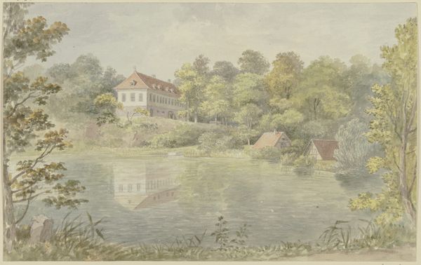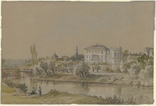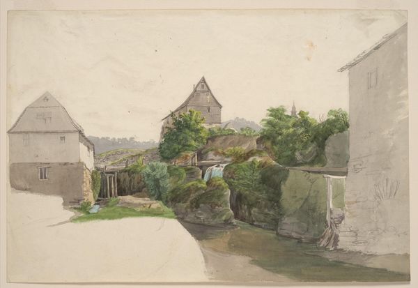 Editor: Here we have Johann Nepomuk Passini's "Ansicht Vom Kurplatz in Bad Rohitsch-Sauerbrunn" from 1848, rendered in watercolor. It gives such a wistful, ethereal impression. I am curious to learn what you see in this plein-air sketch. Curator: What I find compelling is its liminal quality, that sense of a moment caught between visibility and invisibility. Notice how the scene unfolds, partly defined, partly suggested. Do you see how the crisp architectural details contrast with the softer, less defined natural elements? Editor: I do! It's like two realities coexisting on the page. Curator: Precisely! It mirrors the period's broader Romanticist leanings and its exploration of emotional and spiritual states through landscape. Also, think of the 'Kurplatz', the health resort. What meanings or symbolism may such locations convey? Editor: Possibly hope, healing, escape from urban life... and societal gatherings? Curator: Absolutely! Now, considering this was created in 1848, a year of widespread revolution, does this placid, somewhat unfinished scene offer a contrast to that upheaval, or perhaps even a subtle commentary on it? Editor: It definitely feels removed, a little like a dream detached from reality. The incompletion adds to the sense of something unresolved, yet peaceful. Curator: I agree. The "unfinished" elements prompt consideration: Is it a symbol for an unrealized or idealized social project of taking care and gathering? Also consider how watercolors often evoke ephemerality and the passage of time. Editor: This really transforms my understanding; I initially saw a simple landscape, but now recognize those socio-historic allusions. Curator: Exactly. Now, we can appreciate it on multiple registers, noting how its symbols create continuity between lived experience and collective cultural memories.