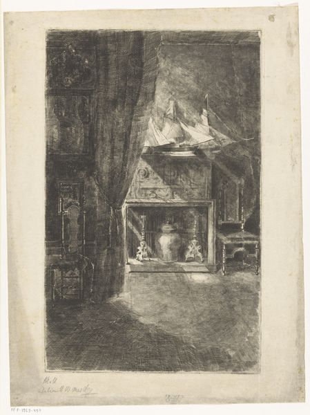 Editor: Here we have "Prieel in een landschap," or "Arbor in a Landscape," an etching by Laurent Verwey van Udenhout, likely created between 1894 and 1913. There's a distinctly medieval feel, and a rather somber tone. What catches your eye about this piece? Curator: It feels like a forgotten place, doesn't it? I’m instantly drawn to that arbor, how it stubbornly centers the frame, yet melts into its surroundings. The whole piece is like a whisper, urging you to look closer at the silent dialogue between structure and nature, between light and the deep, suggestive shadows. Do you feel invited into the scene, or kept at arm’s length? Editor: I feel…invited, but cautiously. The path is clear, yet the details are murky. Curator: Exactly! And that murkiness, that lack of easy definition, invites projection. Consider the trees, their skeletal branches. Van Udenhout isn't just representing trees; he’s evoking something primordial. Perhaps a subtle suggestion that humanity's grandest designs are destined to be reclaimed by the earth, softened and weathered, if we aren't mindful? The arbor's delicate steeple points hopefully upward, but is it reaching towards enlightenment or a beckoning nothingness? Editor: It's amazing how much complexity you've teased out of a relatively small etching. I was mostly struck by the atmosphere, but I hadn't considered those deeper contrasts. Curator: Art often wears multiple masks, doesn't it? And sometimes, the most profound revelations are whispered, not shouted. Discovering new dimensions is a delight. Editor: Definitely. It's helped me see past the surface to the story within. Thanks for that.