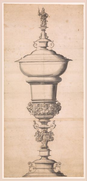 This is a print of a cup by Wenzel Jamnitzer, an artist working in the 16th century. The cup is an ornate object, reflecting the Renaissance era's values and the status of its owner. The intricacies of the design speak to the era's increasing focus on opulence and refinement. It’s difficult for us to imagine an object so precious, used in the everyday. The materiality of the cup is interesting: whose hands would craft, own, and use such an item? Its existence prompts us to consider the socio-economic structures of the time, of the intersections between art, labor, and wealth. This cup is both a celebration of beauty, and a reflection of power dynamics. It encourages questions about who gets to create, who gets to own, and what stories these objects silently tell us about the world of then, and of now.