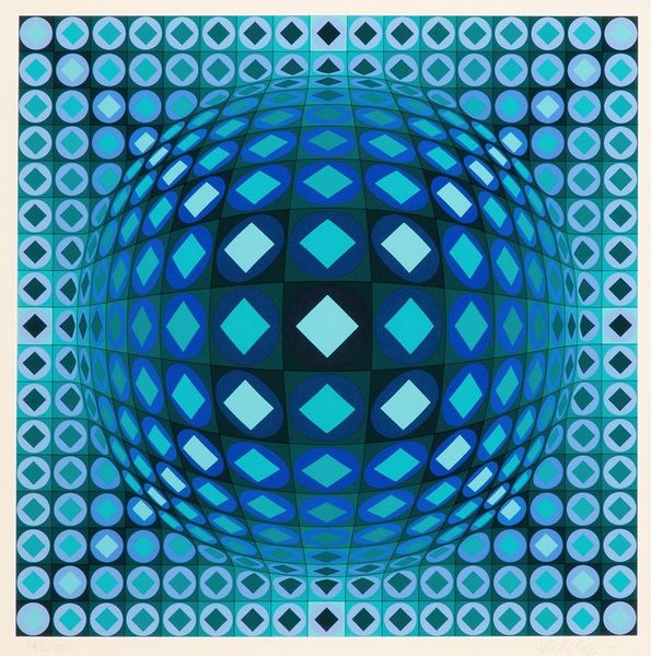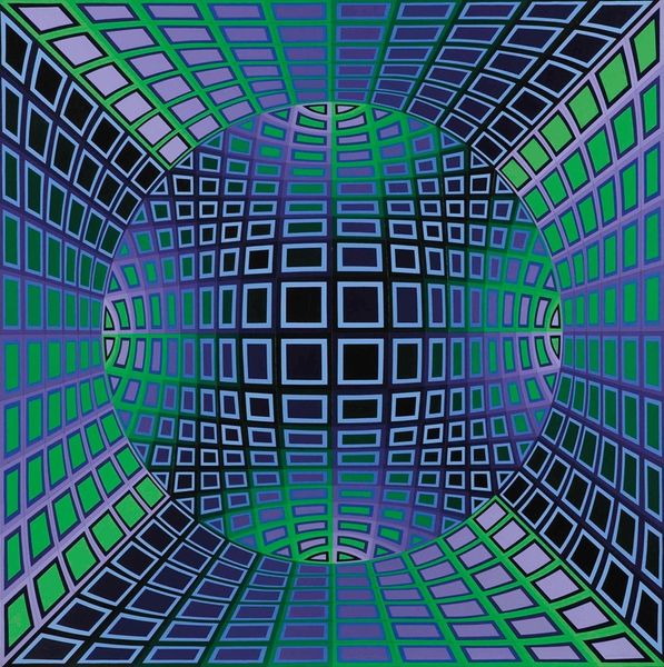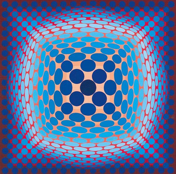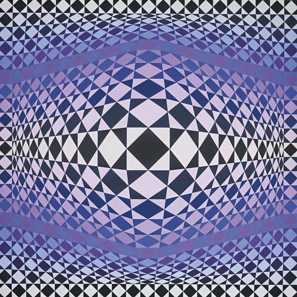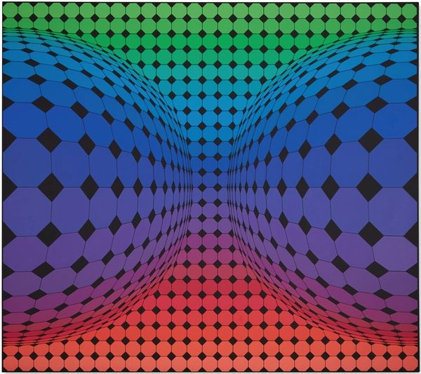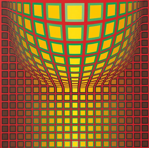 Victor Vasarely’s *Caldor* is a mesmerizing example of Op Art, made with paint on canvas. The impact of *Caldor* lies in its illusionistic depth, a visual trick achieved through precise application of color and form. Look closely, and you will see the meticulous process of painting, each shape and color carefully considered to create this effect. Vasarely has employed a high level of craft and mathematical calculation to achieve this. The shapes are uniformly painted, giving the overall feeling of a factory-made image, questioning what the hand has to do with the work. Vasarely’s serial, geometric style lends itself well to mass production, as was the case with much mid-century design. This piece reflects an era of increased industrialization and mass production, blurring the boundaries between art and design. By embracing such methods, Vasarely challenges our conventional notions of art, inviting us to consider the social and cultural implications embedded in the making of art.